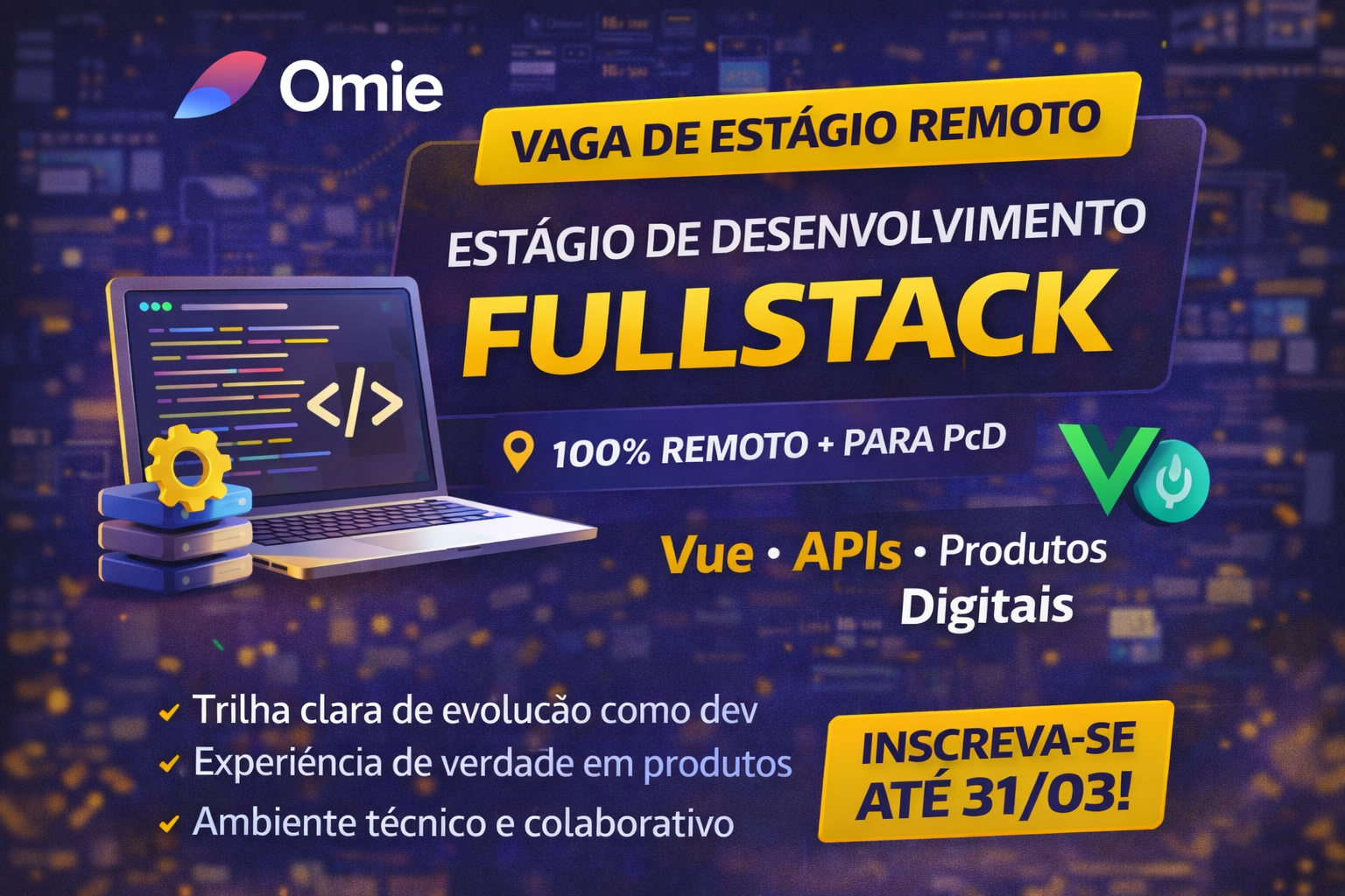 A Omie está com inscrições abertas para Estagiário(a) de Desenvolvimento Fullstack, em modelo 100% remoto e com oportunidade também para PcD. A vaga foi publicada em 11 de fevereiro de 2026 e recebe candidaturas até 31 de março de 2026.
